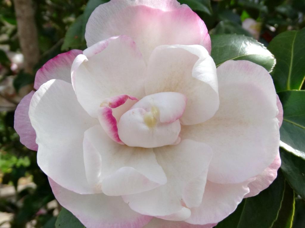 ‘Beatrice Emily’ has a dense, bushy growth habit typical of sasanqua varieties, forming a medium-sized evergreen shrub that responds well to shaping.