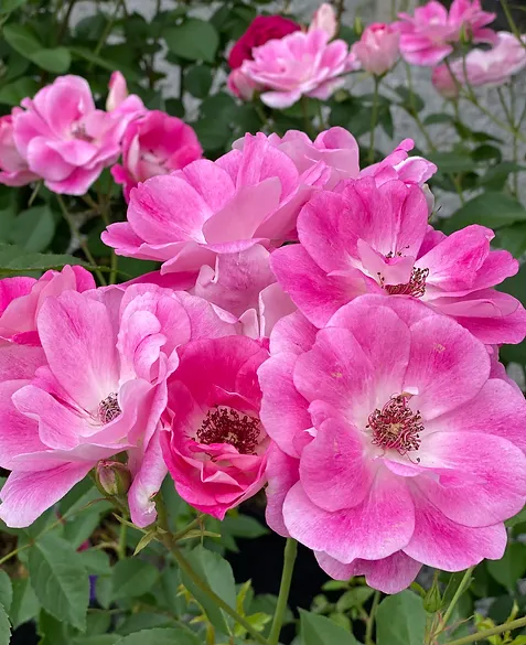 - Flower: Bright pink; medium semi-double blooms in large clusters