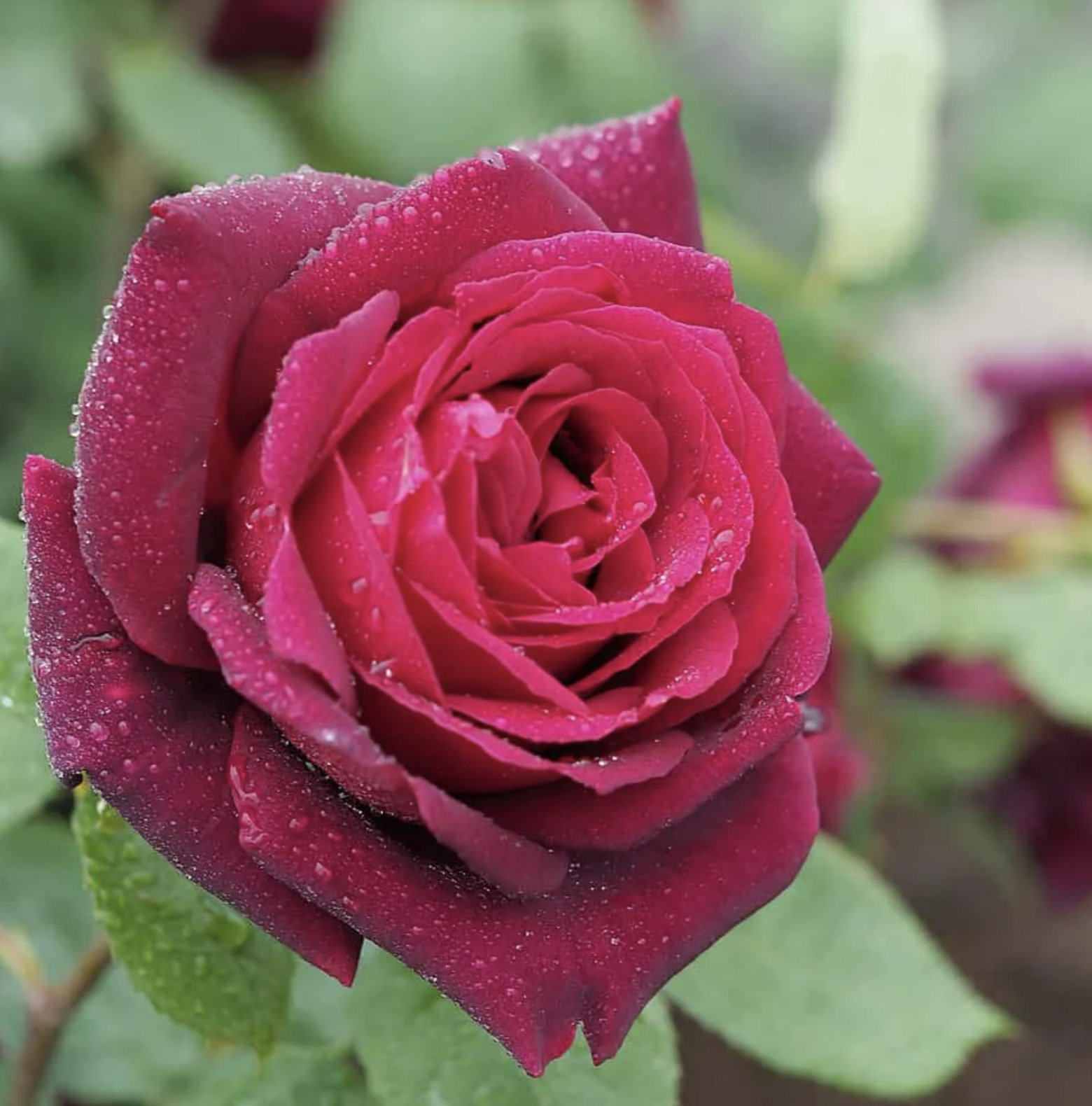 A classic hybrid tea rose producing large, velvety blooms in very dark red, often appearing almost black in certain light. With its rich colour and strong fragrance, it makes a bold and dramatic feature in the garden.